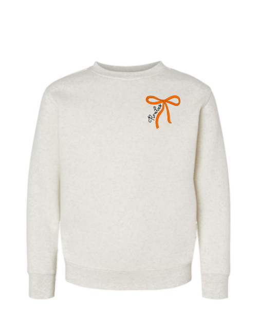 A classic crewneck with a modern bow embroidered font. You can customize this for your team, just add your mascot in the product box provided. Thread colors will be your school primary color and an accent that compliments it.