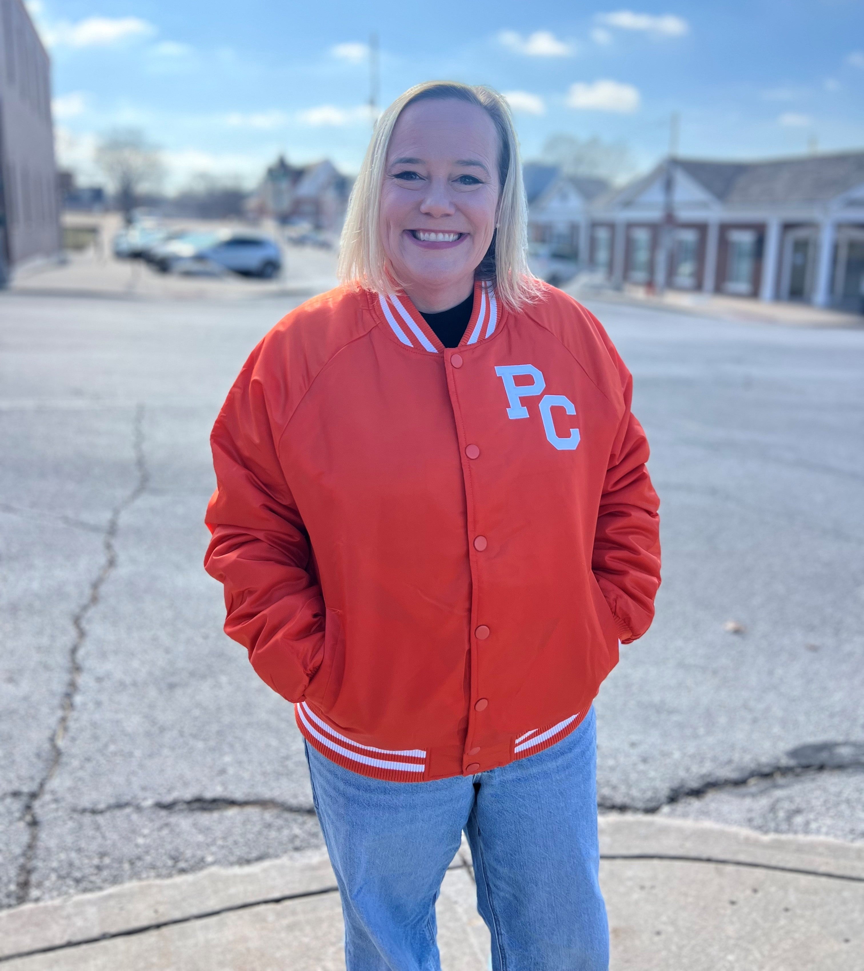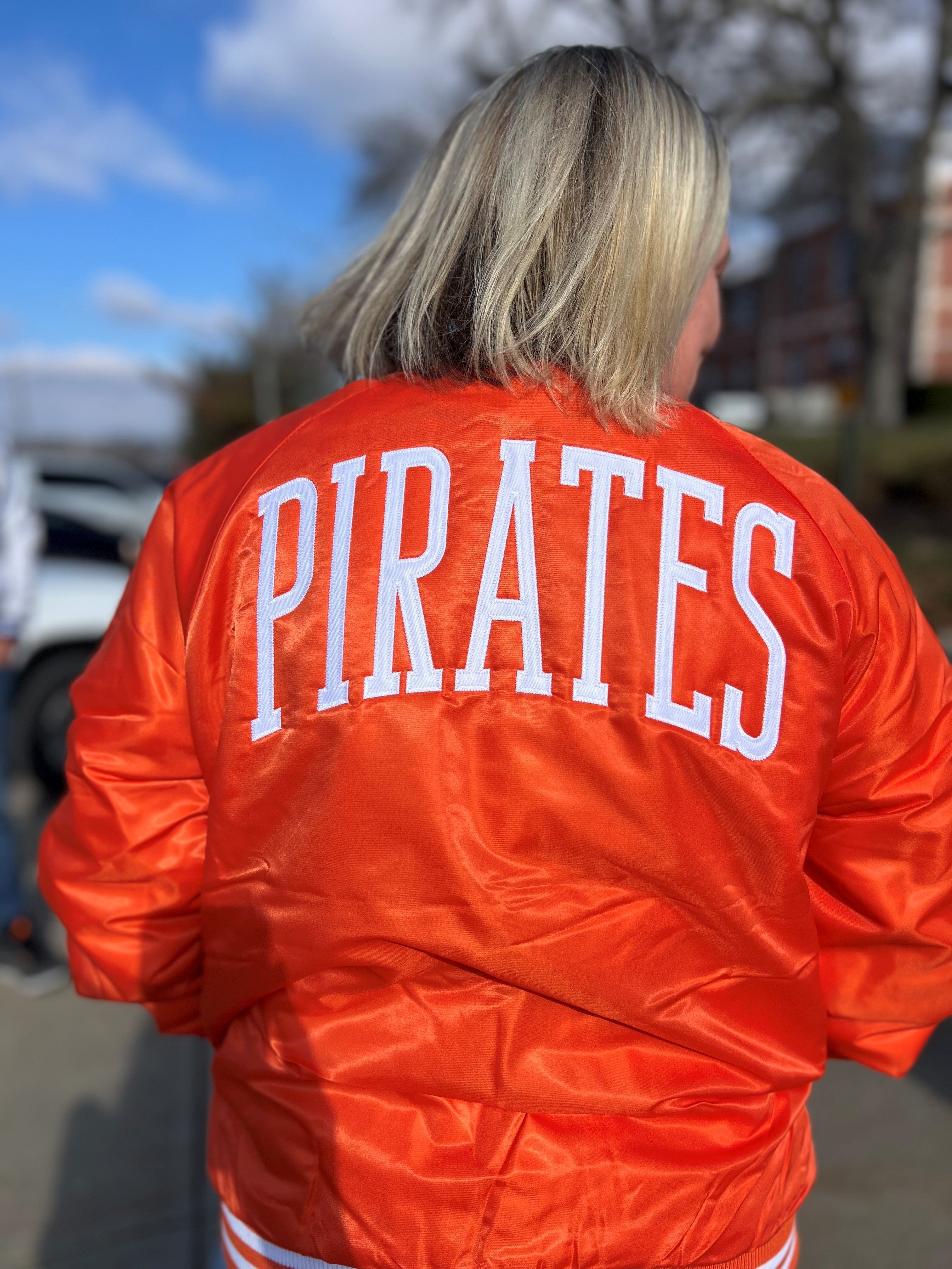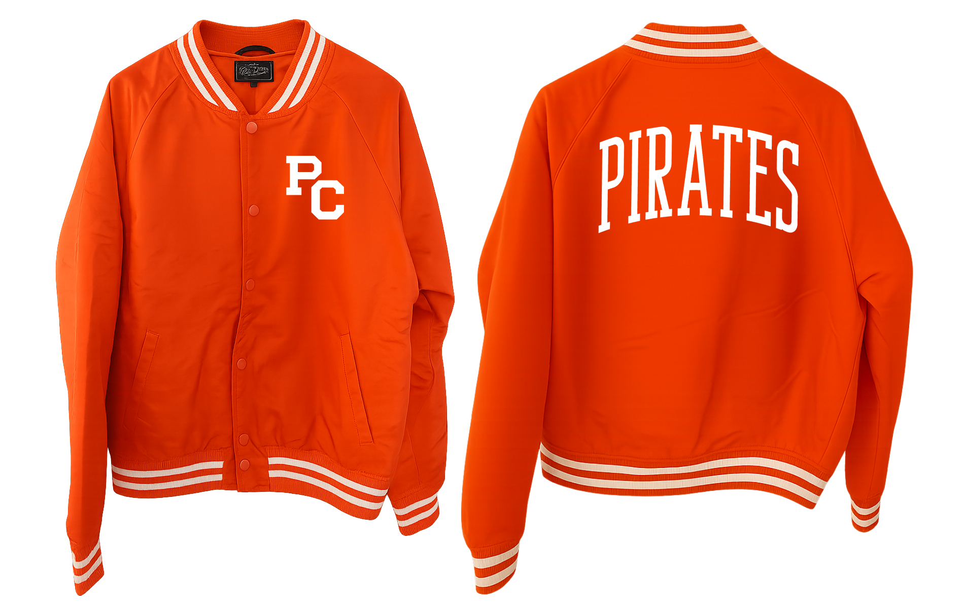 Bring back the Glory Days with this custom varsity-style bomber built for true Pirates fans. Designed over months of development and perfected for everyday wear, this jacket blends retro athletic styling with modern comfort. The bold orange shell pops with crisp white detailing, featuring a classic PC chest mark and PIRATES arched proudly across the back.